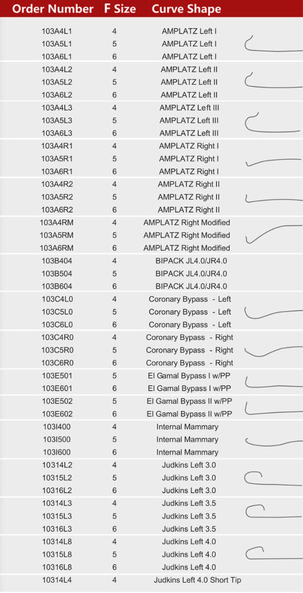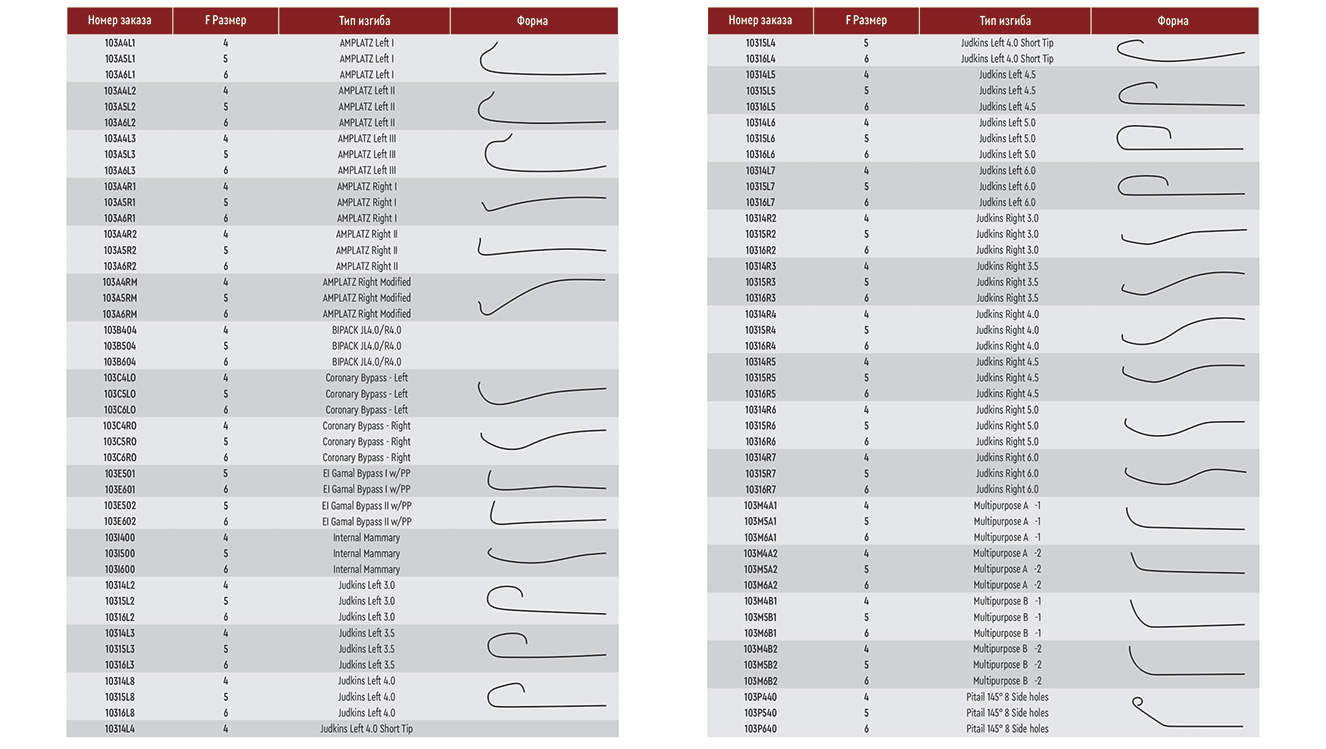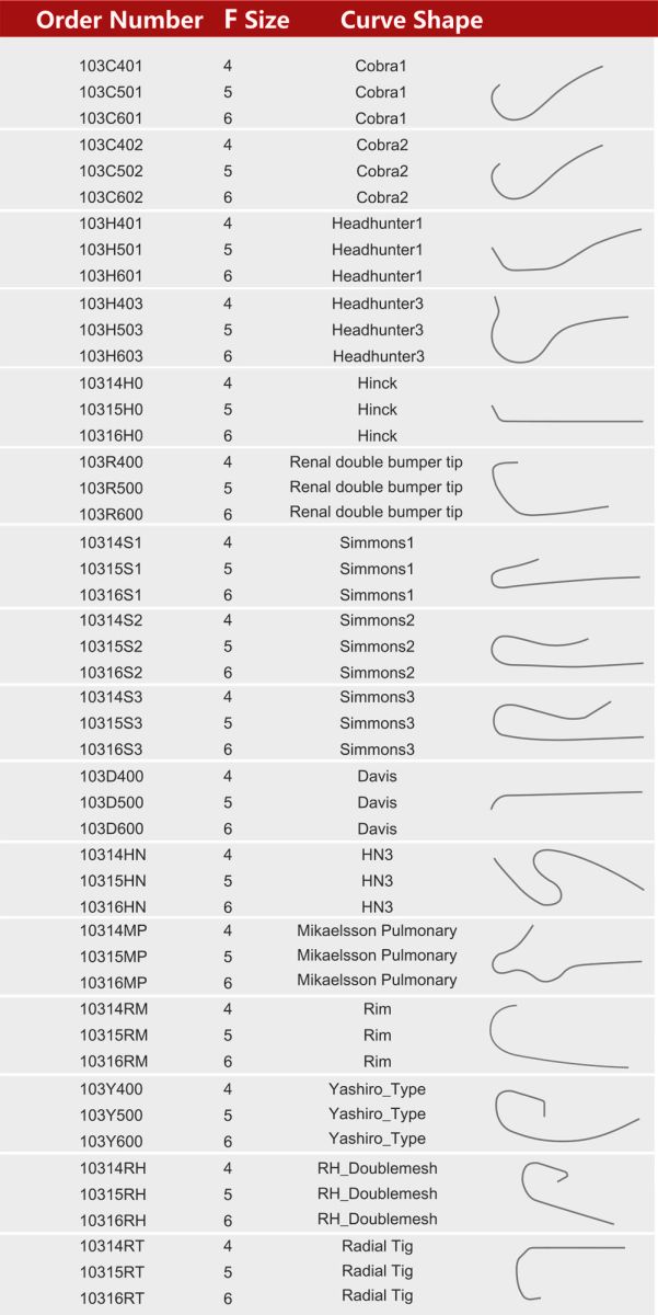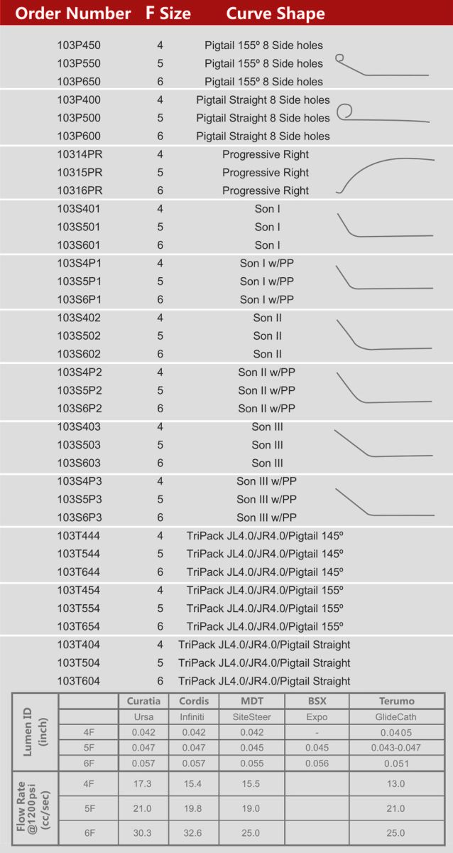 Катетеры доступны во многих различных формах изгиба и трех размерах 4, 5 и 6F. Боковые отверстия могут быть встроены в мягкий удлинитель для облегчения инъекции рентгеноконтрастного вещества.