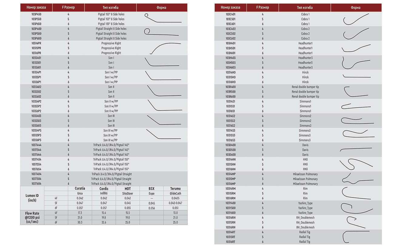 Катетеры доступны во многих различных формах изгиба и трех размерах 4, 5 и 6F. Боковые отверстия могут быть встроены в мягкий удлинитель для облегчения инъекции рентгеноконтрастного вещества.