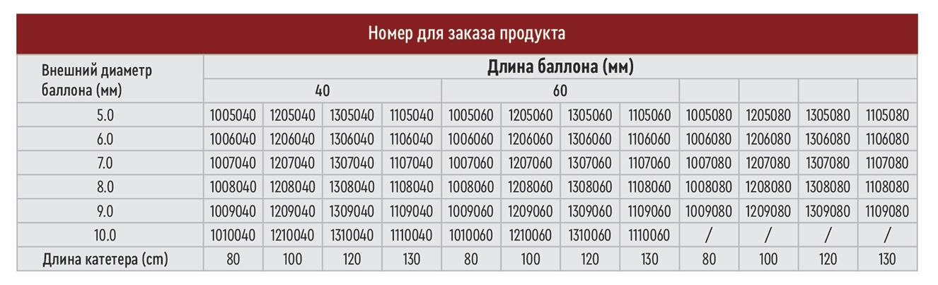 Диаметр баллона: 5.0 мм, 6.0 мм, 7.0 мм, 8.0 мм, 9.0 мм, 10.0 мм.