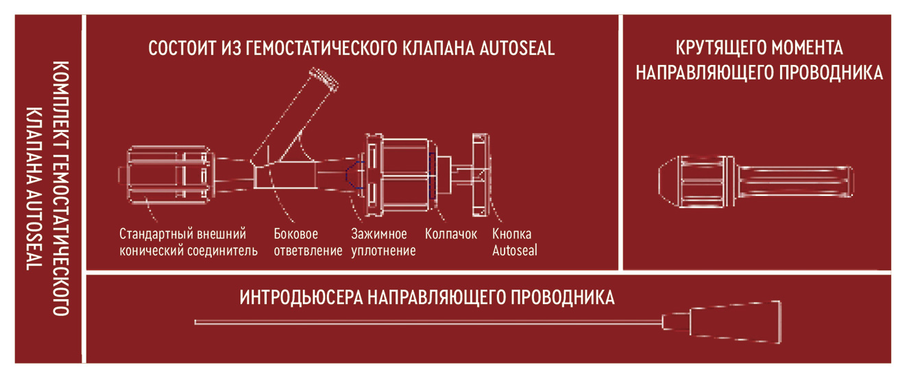 Комплект гемостатического клапана AutoSeal, включающий гемостатический клапан, крутящий момент направляющего проводника и интродьюсер направляющего проводника.